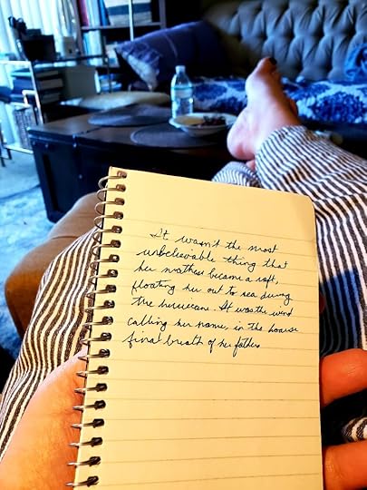 PS I like writing in a small spiral notebook like this so I can visualize, as I go, the size of the story. This is a Mead Cambridge 6×4, 70 sheet. I prefer to notebooks that are not too precious. This is a quality workhorse in that it aids being held in the hand w/its sturdy cardboard back. I can also easily tuck it into a purse. Tools are important. Not absolutely critical of course but anything I can do to help myself, I’ll do it.