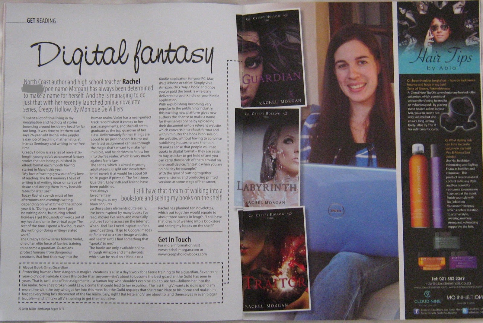 Click to enlarge.Yip! That's me! My first magazine "appearance", sharing space with a hair ad.And I totally always write on the couch outside with my laptop on my lap.(Um, not!)
