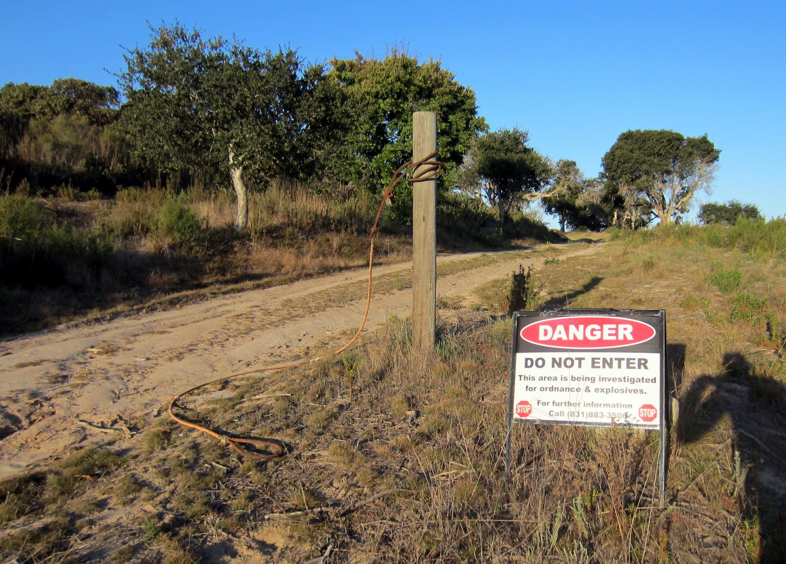 It says, "DANGER. DO NOT ENTER. This site is being investigated for ordinance and explosives." Sounds pretty convincing, huh? I've written before about how Fort Ord is one giant munitions dump, with shells and casings lying around pretty much everywhere you look. The great fear, of course, is that some of the ammo on the ground is still live, which could obviously create a huge bummer for anyone unlucky enough to trip a landmine or step on a grenade somewhere.
