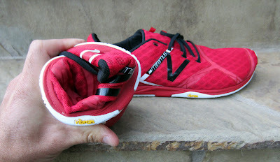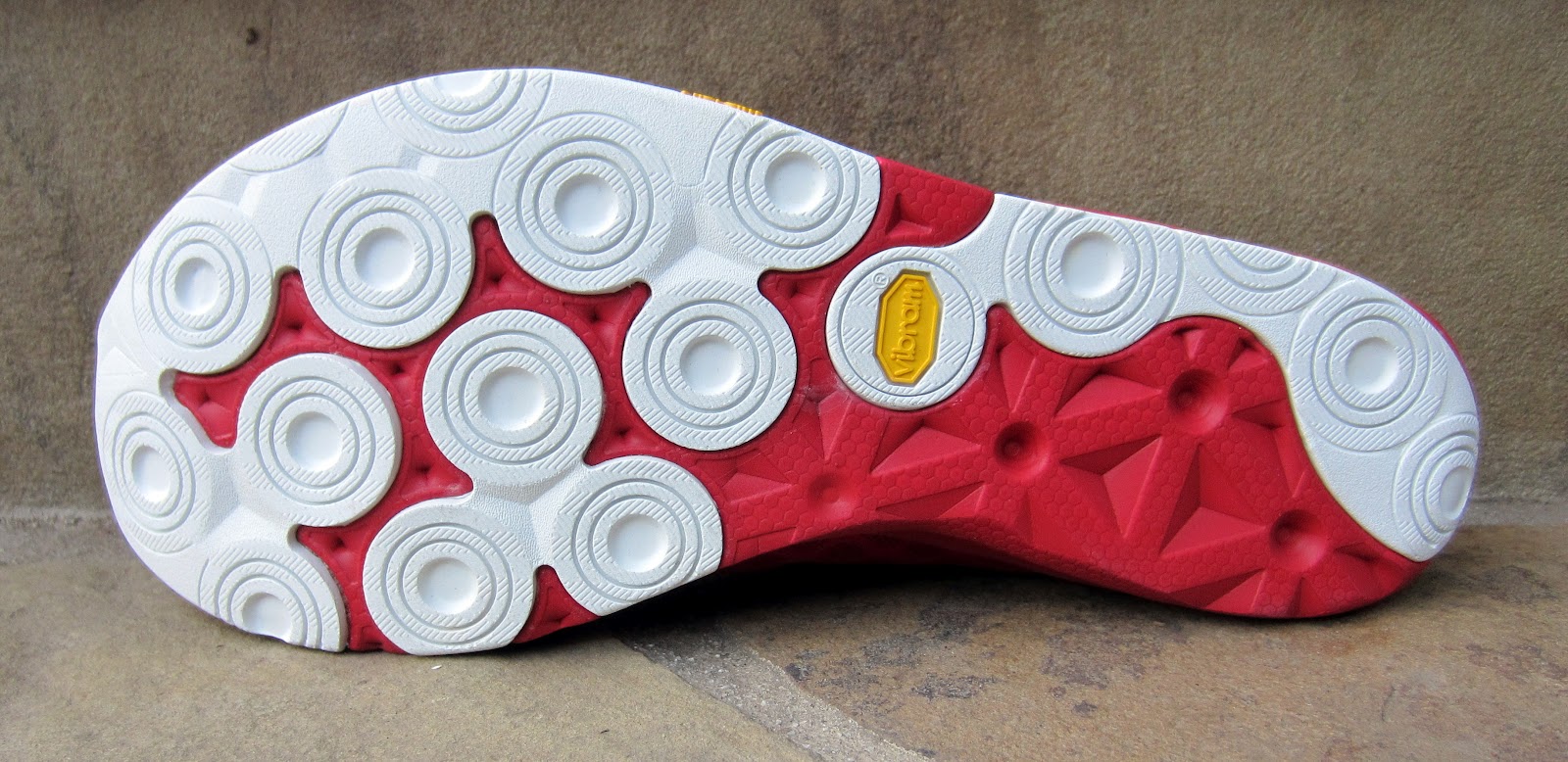 … outsole rubber is used very sparingly, similar to what Vibram does with its Bikila models. The red portions above are EVA foam which runs the length of the shoe, and the white is Vibram rubber. This particular rubber compound is softer than the Vibram outsole on Merrell shoes, so durability may be an issue after a few hundred miles (I currently have about 150 on mine, and there's no problem yet). The outsole tread is fine for standard road use, but I've found that traction is somewhat lacking on slick asphalt, and especially on fire roads or gravel.