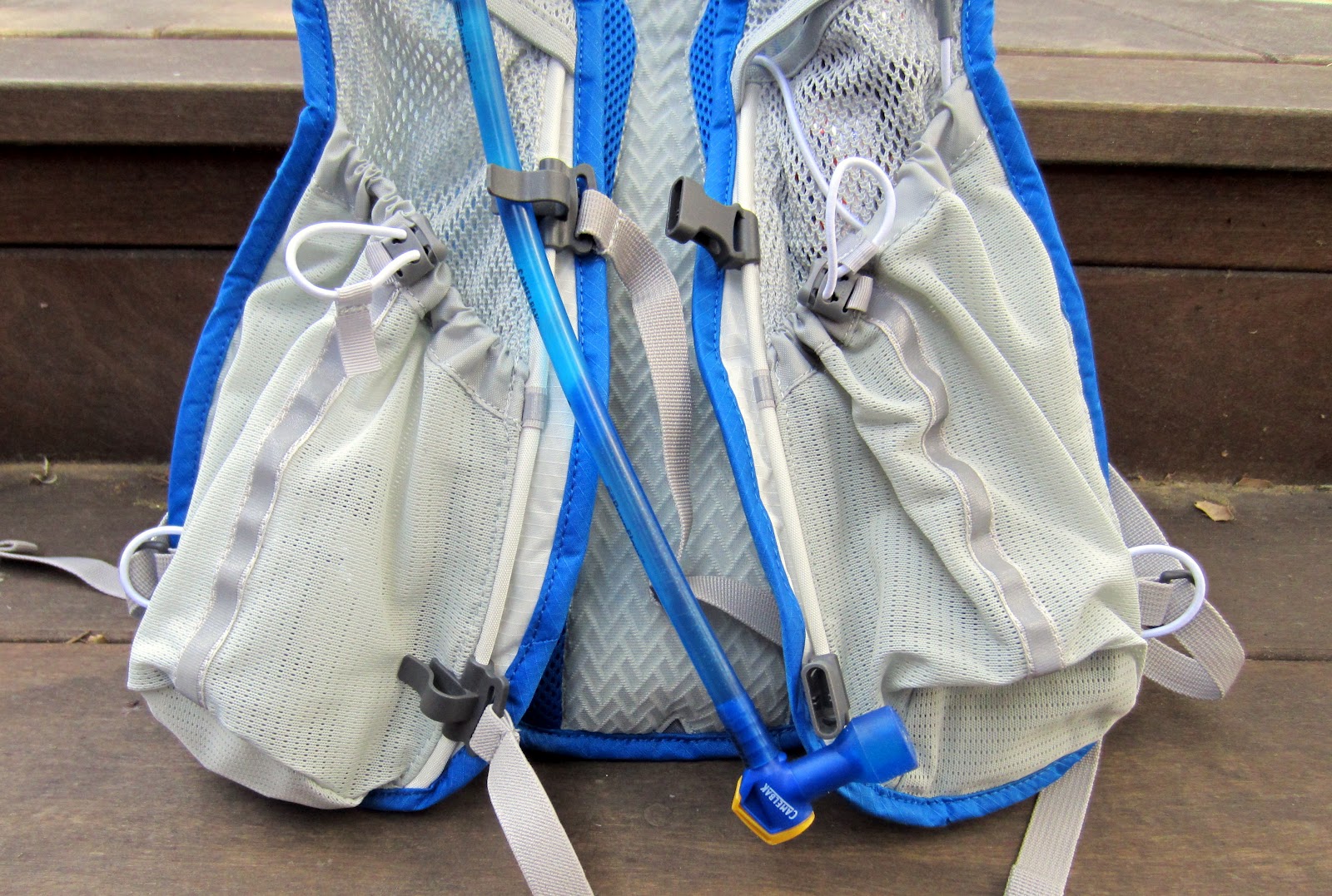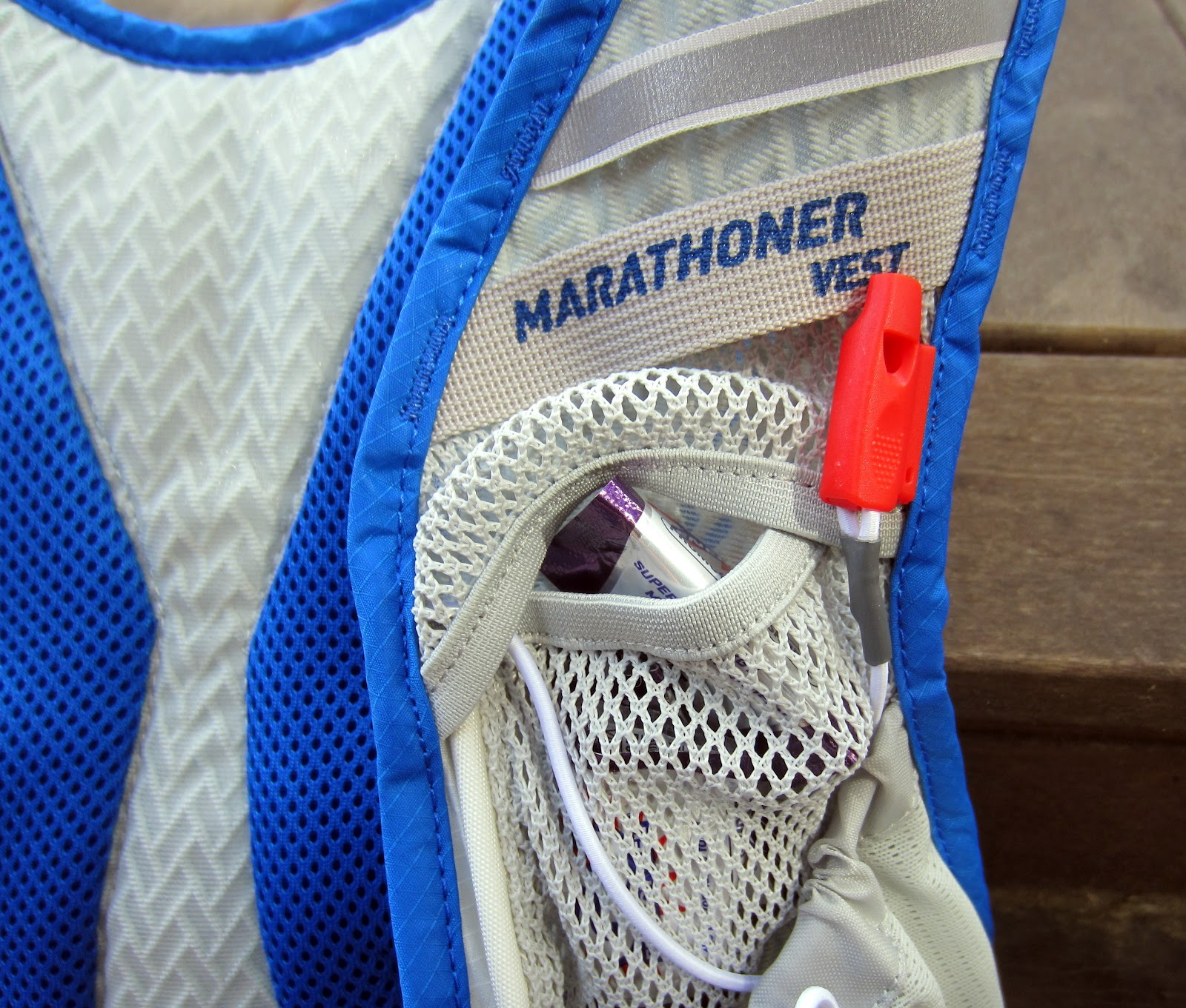 Another major distinction between the Marathoner and the 020 is that the Marathoner has a much greater cargo capacity on the front vest straps. In addition to the bottle pockets (which can be used for other gear if not for fluids), there are two inner-layered pockets behind the bottle pockets on each side, which make for a nice place to stash used empty GU wrappers or larger items like a smart phone. The front cargo capacity is actually greater on the Marathoner than it is on the 020, which is good, because …