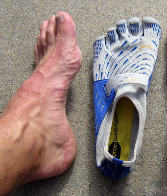 … when I tried to tighten the strap too much, the result was usually a small blister on my instep, like this one after a 7-mile track workout. You have to click/enlarge the photo above to see it, but the spot where the strap pulls the instep material tight becomes a point of irritation with a tight strap.