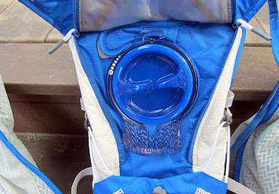 … that compartment is completely occupied by the fluid reservoir, which is a significant design change from previous CamelBak running packs. On the Marathoner, the compartment that houses the reservoir is quite thin, and is cinched closed with a large Velcro strap that goes across the top of the opening. The advantage of this design is that the fluid compartment is extremely secure, with very little bouncing regardless of how full it is. The tradeoff is that you lose the ability to stuff other gear in there, effectively decreasing your overall cargo capacity.