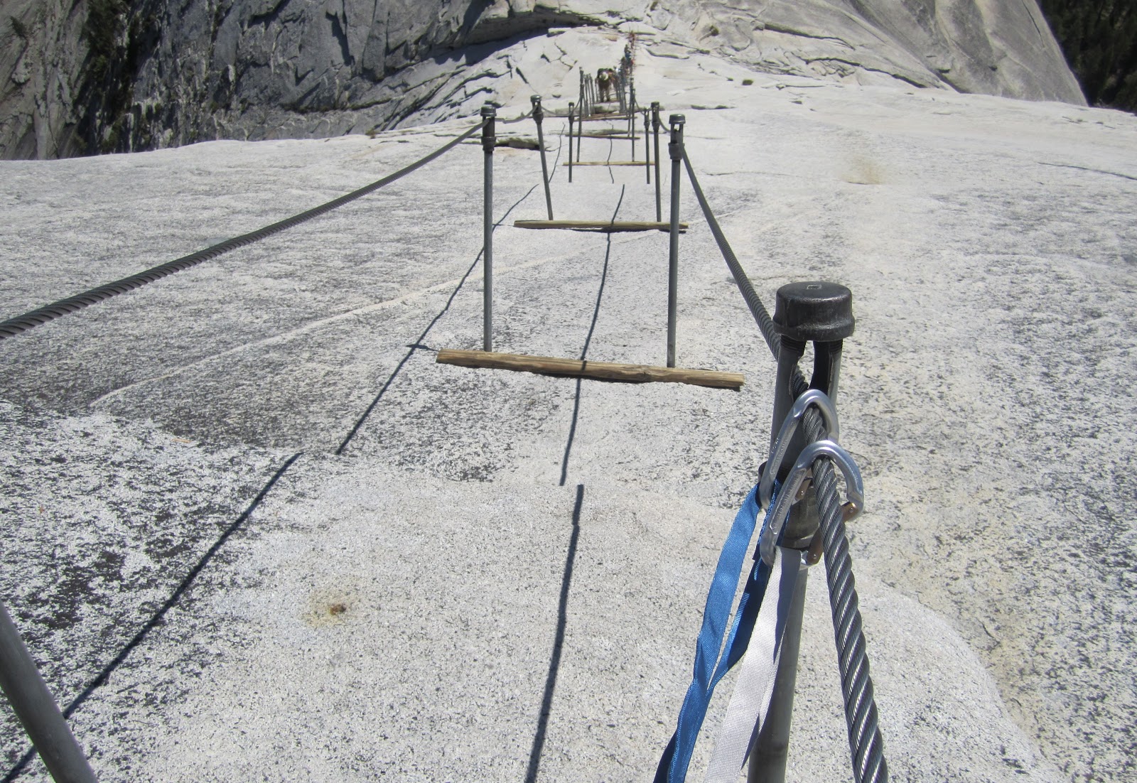On the whole drive up and throughout the hike, I purposely didn't say anything to my son about someone dying very close to the exact spot where we now stood. But as we were at the base of the cables and I was giving him a lesson on carabiner use, we spotted a woman coming down the cables using the same kind of harness system. I pointed her out and told my son to watch how she alternated the clips as she went along. When the woman arrived at our spot, she started the following conversation: