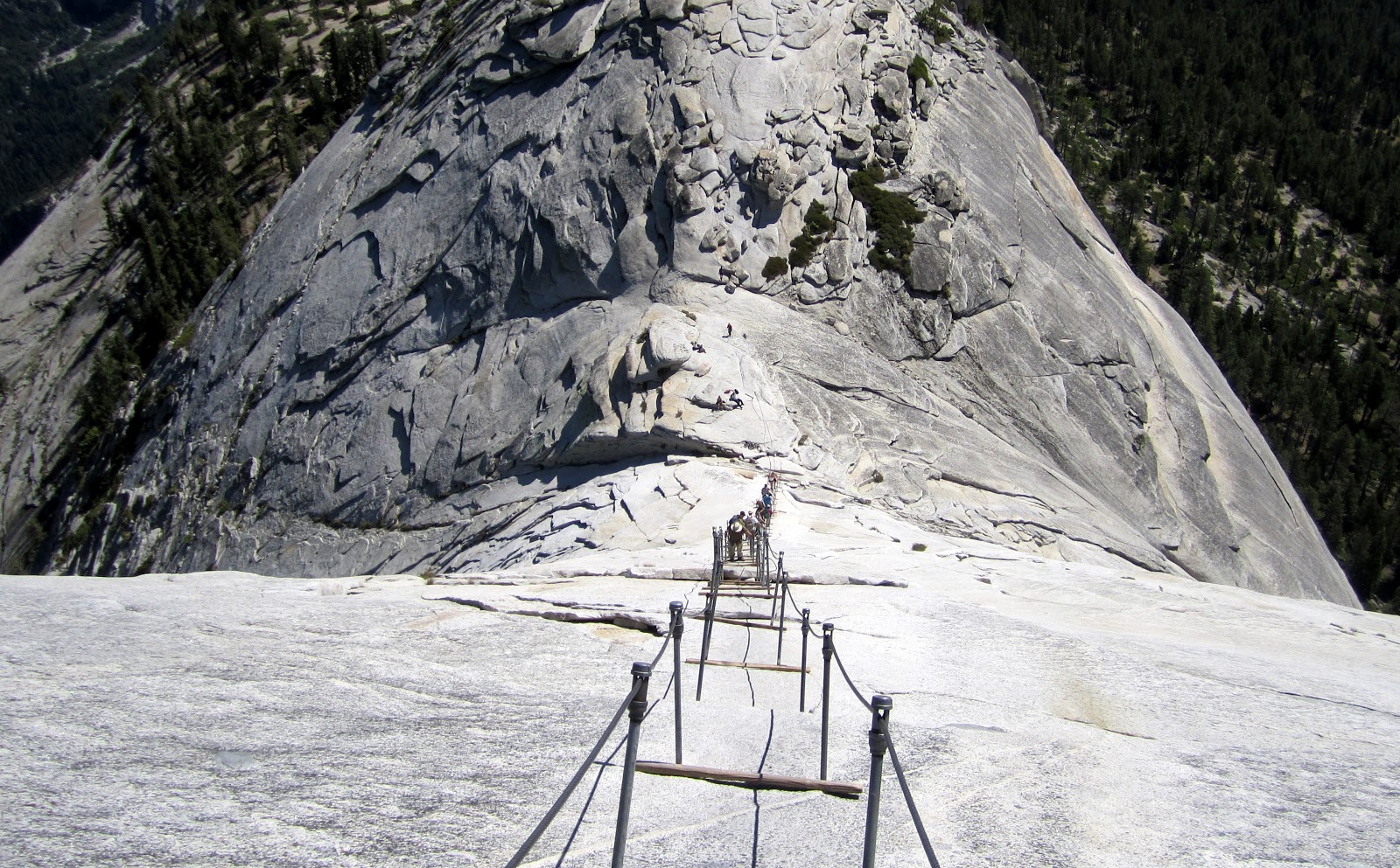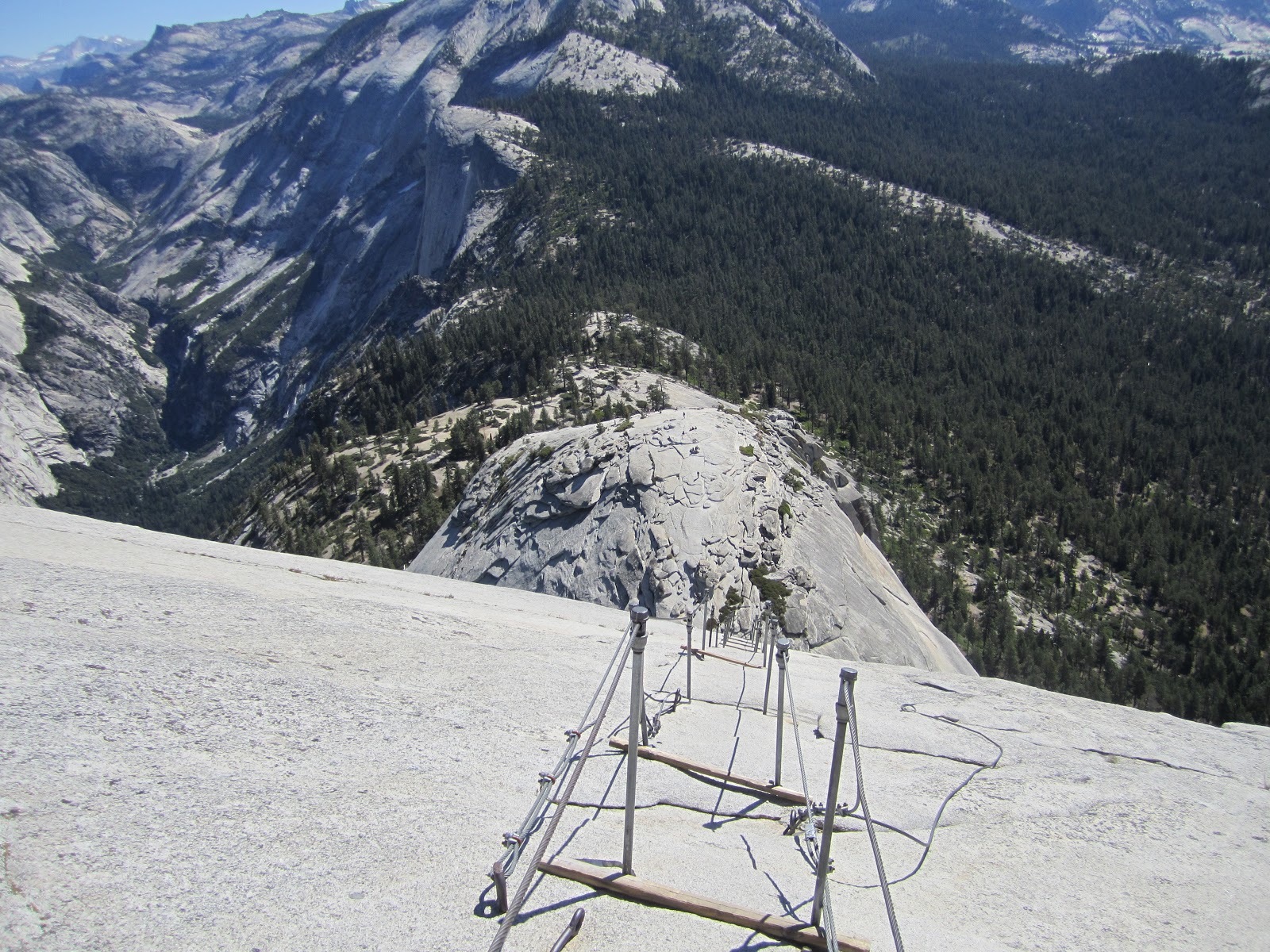 Thankfully we were the only ones on the cables, which meant that we could take all the time we needed. We inched our way through the first minor slope together, and by the time he was about halfway up, my son was managing on his own quite well – which was great for me, since I was having my own concerns about staying anchored to the granite on the nearly 45-degree pitch.