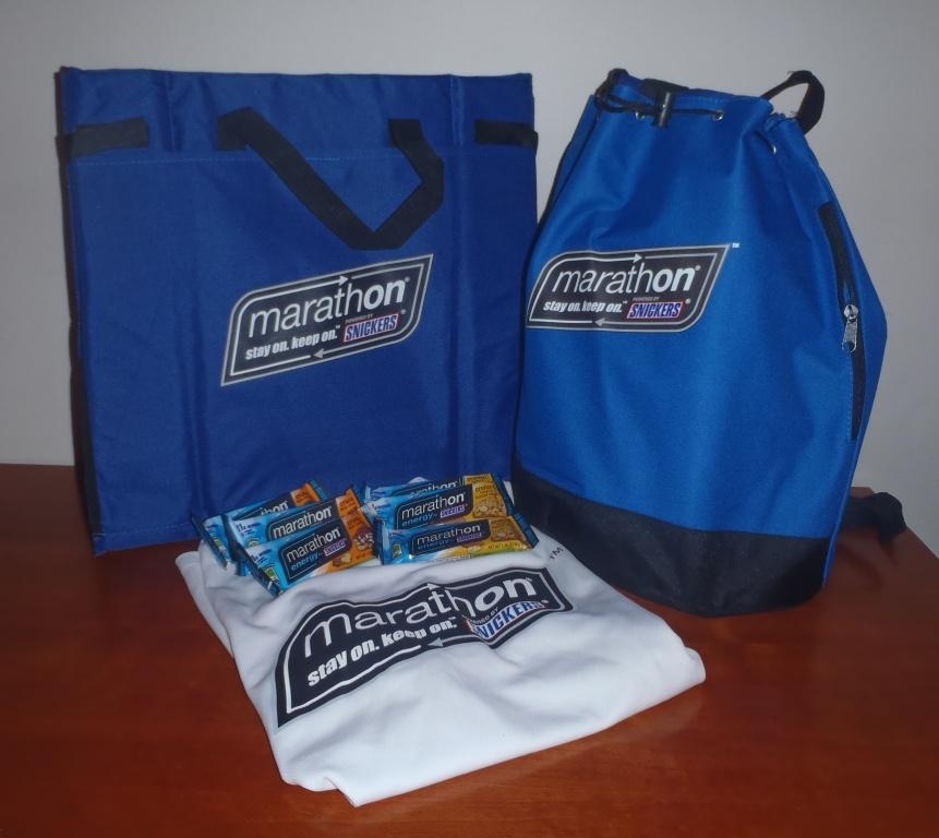 Actually, the giveaway includes more than just energy bars; Snickers will provide three winners with a Marathon prize pack (see below), including a tote bag, a tech fabric shirt, and a cool little portable chair that's great for taking to the beach or youth sports games. You'll also get the same samples of energy bars and protein bars that I tested for this review.