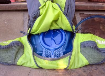 Two diagonal zippers create a lift-flap for accessing the reservoir. It's very easy to use in your kitchen, but refilling fluids in the field could be problematic for a couple of reasons. Since the access point is on the bottom half of the pack instead of the top, you have to hold the entire pack sideways or upside down if you want to keep the reservoir inside the pack while refilling. Also, if you take the reservoir out to refill it, placing it back inside the pack might be difficult if you're carrying a lot of cargo, especially in the side pouches. For training runs you might have time to work around these issues, but if you're looking for a pack to move through aid stations quickly during a race, this is a major drawback.