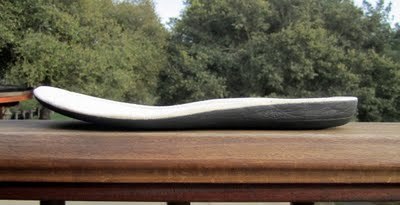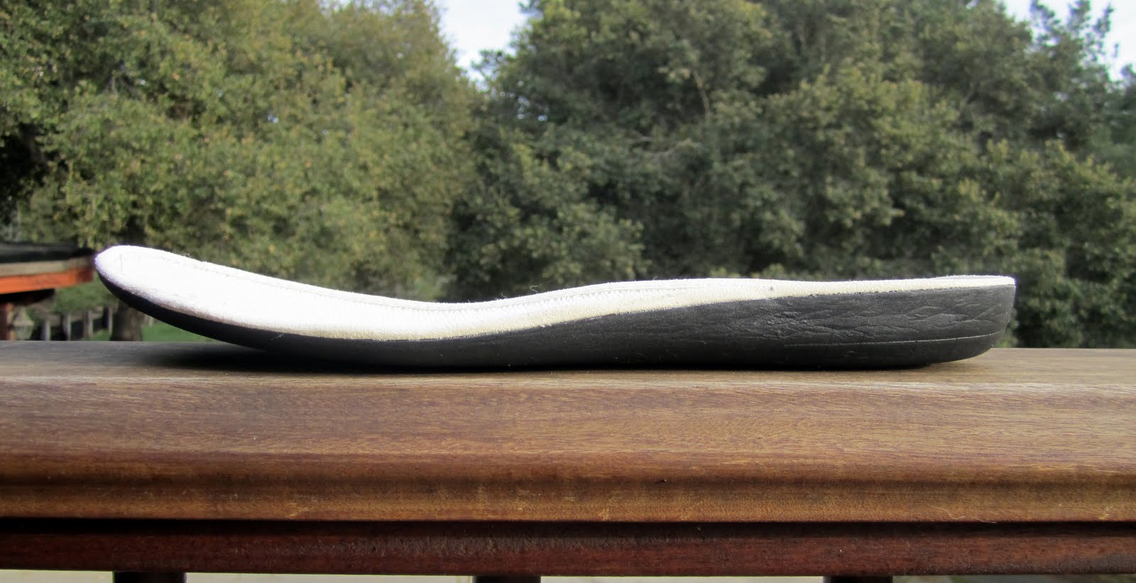Here's what I mean about the Pau not being a true minimalist shoe: the standard issue model comes with an insole that is 1" high in the heel and tapers to the forefoot. However, the insole is removable, and that was the first thing I did after receiving the shoes. There's no additional midsole layer, so once the insole is out, you've only got the layer of hevea rubber between you and the pavement. You could also put a thin, flat insole - such as the one Patagonia uses in its Advocate moccasin - in place of the thick one on the Pau if necessary for comfort or to make up for the fit differential (see below).