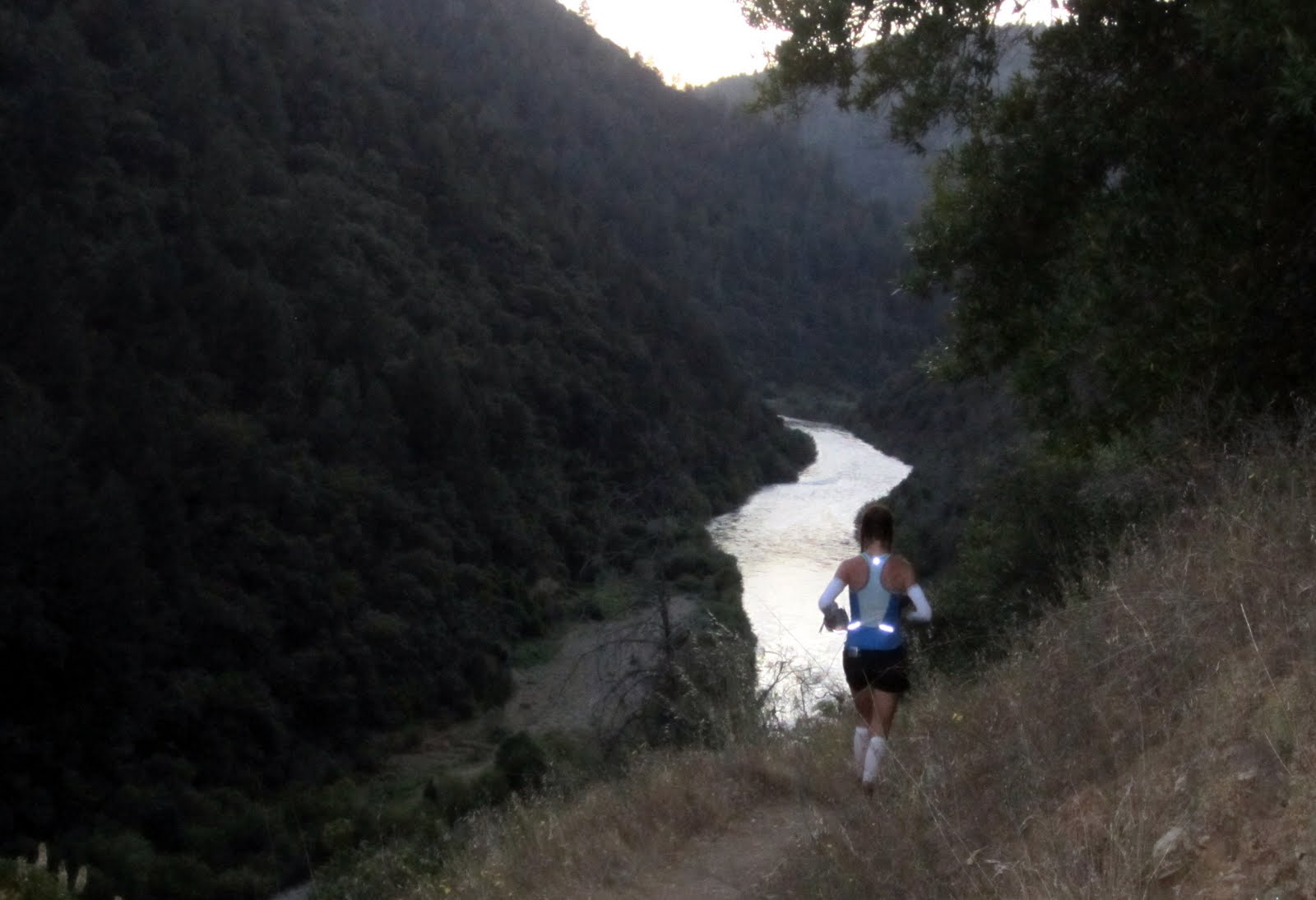 After she emerged from the trail, Gretchen gave me a quick status report (the short version: she felt great) on our way to Foresthill, where she made a quick aid station stop, and we set off down the beautiful, gently sloping single track on our long descent towards the American River crossing at mile 78.
