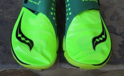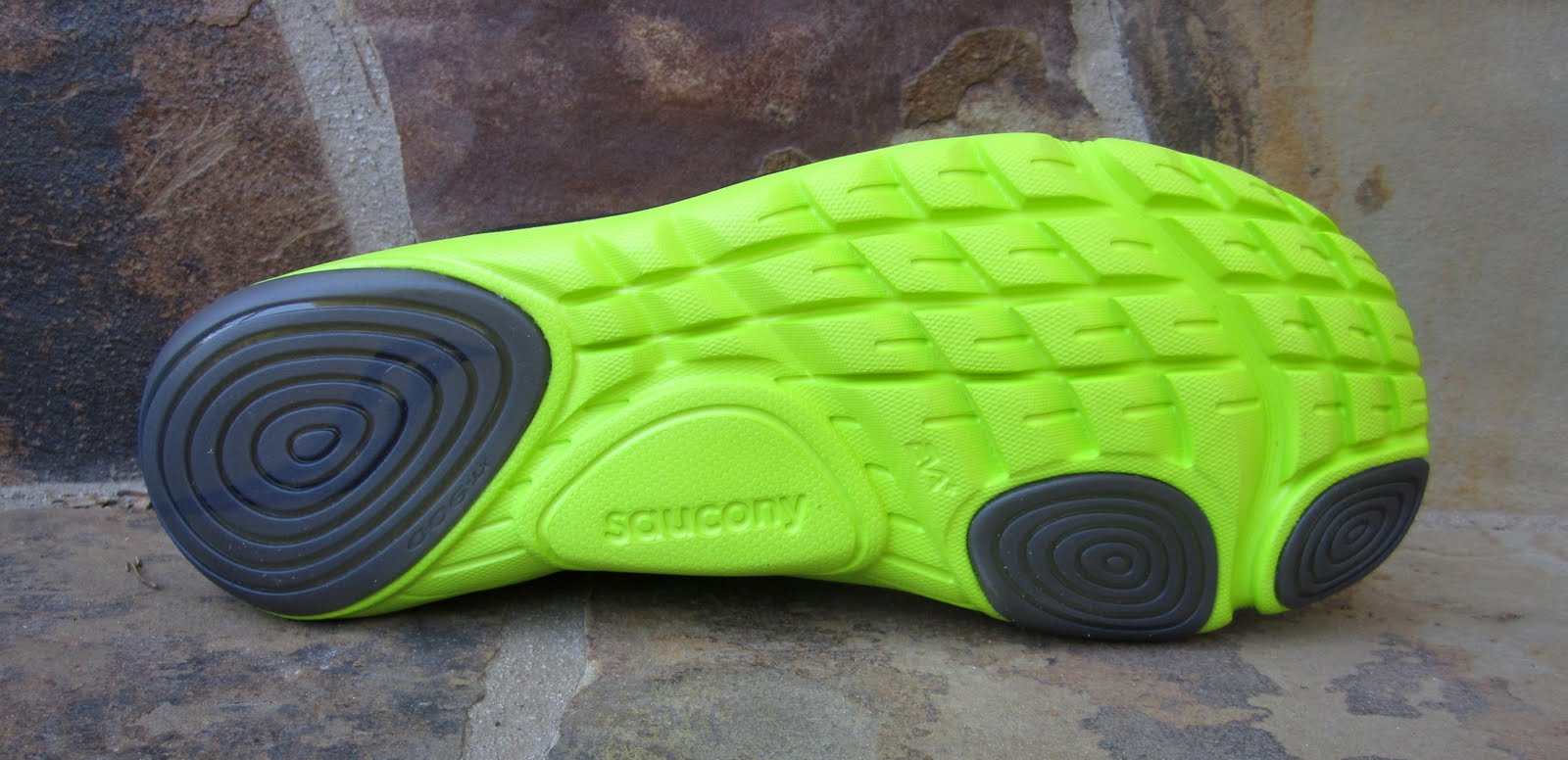 On the underside of the shoe, Saucony decided to go with nearly 100% EVA construction; there's no reinforced rubber aside from the gray areas you see above. Considering that this is intended as a minimalist shoe, the placement of the rubber seems a bit odd – at the very least, the reinforcement at the forefoot area should be significantly larger.
