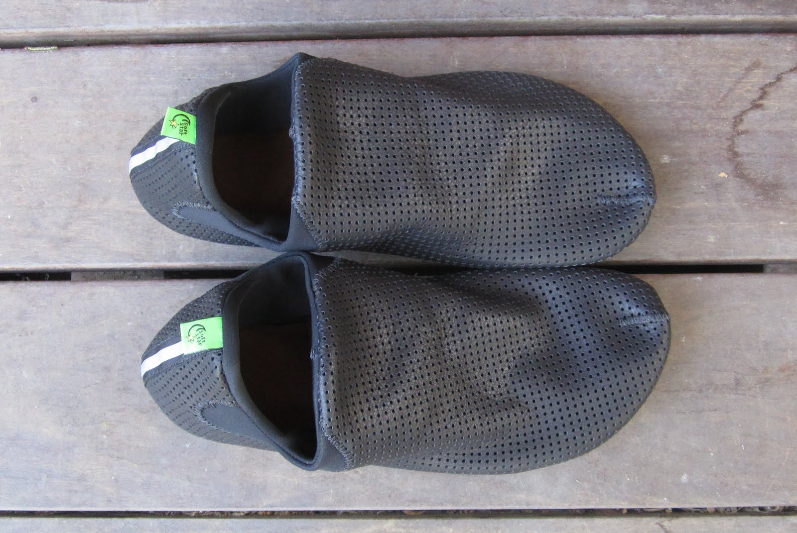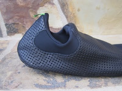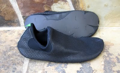 Uppers of the Hattori are composed of a very thin stretch mesh fabric, with a toe-box shape that the website describes as a "mitten-like" fit (apparently the word "glove" has been a bit overused recently). The idea was to have a sock-like (or possibly neoprene-like) fit, but I found the overall dimensions to be uncomfortably restrictive, especially on the lateral aspect where my pinky toe presses into the 4th toe. This has as much to do with the shape of the last as with the cut of the upper, but the end result was that I didn't have any toe splay upon foot strike, which is a bad mark in my book. If you have narrow feet, it may not be a problem.