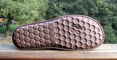 Green construction is most evident in the outsole, which is made of 70% hevea milk latex, a sustainable resource derived from the tropical hevea tree; you can read here about how the tree's milk is processed into rubber. The outsole has a honeycomb pattern similar to VivoBarefoot models, except that the rear foot honeycombs are convex while the forefoot ones are concave. Thickness of the outsole is 12mm, which is thicker than the VivoBarefoot Oak but slightly thinner than Merrell's Tough Glove.
