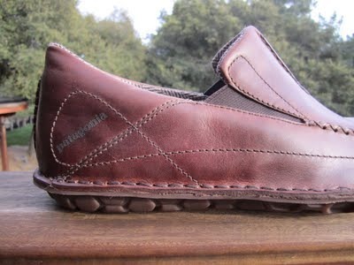 Another eco-friendly production method is known as Opanka stitching, which is a European method of shoe construction where the outsole is hand sewn onto the upper, rather than glued with chemical adhesives. This stitching is evident around the entire outsole as well as the top of the upper and the back of the heel. It's a very durable construction method that minimizes the use of toxic byproducts.