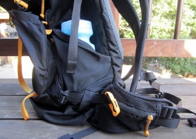 In addition to a small sternum strap, two larger side straps attach at the abdomen; these are comprised of two zippered mesh pockets that are large enough for cameras, energy bars, GPS devices, or phones. The side straps also incorporate Mountain Hardwear's OTF (On The Fly) Compression design which allow you to adjust the overall tension of the pack against your body with a simple pull or release on each side.