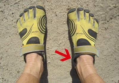 One of the design changes I wasn't crazy about was the addition of a second strap to the upper. Stylistically, this two-strap design borrows from both the KSO (with its single strap that wraps around the heel) and the original Bikila with a top strap that isn't integrated around the heel. On the Komodo, there is a second, independent Velcro strap to adjust the heel fit – but in practice, I found that cinching this strap tighter than the "factory" positioning resulted not in a more snug ankle fit, but in gapping at the inside of the ankle, as seen here: