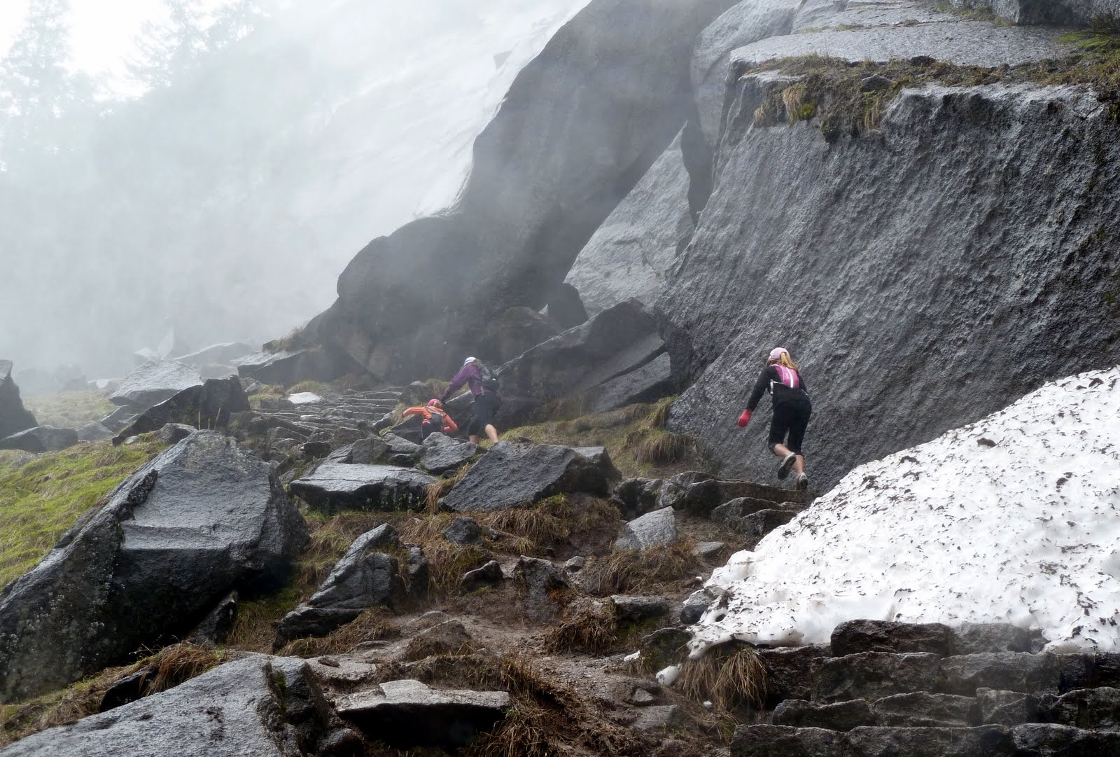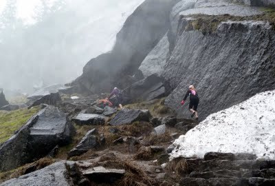 … before ultimately blanketing everything in sight, which thankfully didn't occur until just below the top of the climb. Incidentally, see that rock there? That's one of the ones I sat on while taking a "sun break" to warm my toes up a bit, as I mentioned in this post about wearing Vibrams in the snow.
