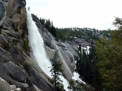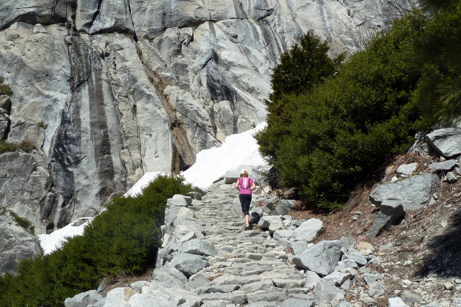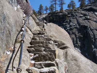 The upper portion of the Mist Trail is essentially one long staircase, much of it in direct line of sight with Nevada Fall – but since the spray from this fall blows in the opposite direction, it's not nearly as cold as the section below Vernal Fall.