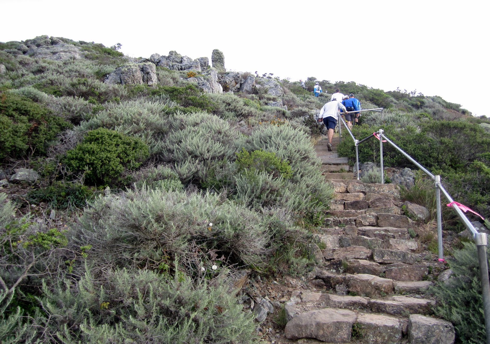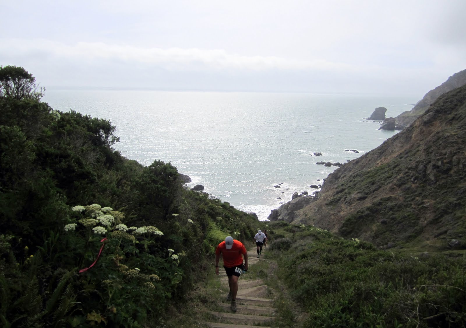 Leaving Rodeo Beach (for good this time), this year's route generally took us in reverse through the final section of the traditional race. In my previous Miwok report, I griped about having to go down this large stone staircase at mile 61; this year, we went up them instead. Don't be shocked when I say this … but it turns out that up is harder.