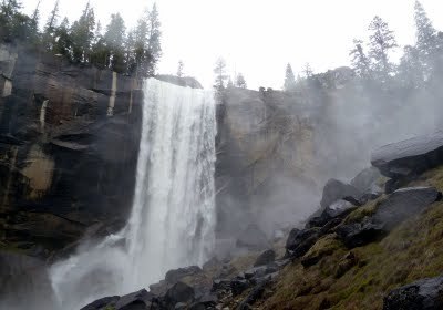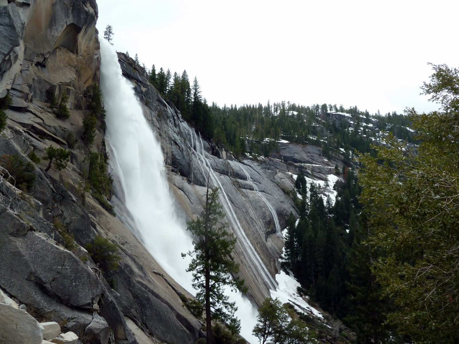 For the most part, the trail to Vernal Fall was passable, aside from a few little snowbanks to maneuver around here and there. However, between cool temperatures, an overcast sky and getting increasingly soaked, the chill factor on this stretch of trail became pretty bad. But to our pleasant surprise, nobody really complained about it.