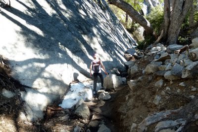 Our objective for the day was Yosemite Falls, which at roughly 4 miles from our starting point at Yosemite Lodge was only slightly longer than the previous day's outing, but has an additional 700' of climbing, much of it over very irregular rocky terrain. (I've also profiled this hike in a previous photo tour from two years ago.) If there are any city folk reading this who want a frame of reference, the hike is roughly the equivalent of climbing up two Empire State Buildings – except that instead of having an enclosed stairwell and railing to hold onto, the path on the top third of the climb is covered in snow, frequently gets slippery, and is less than 1 foot wide. Hopefully that helps.