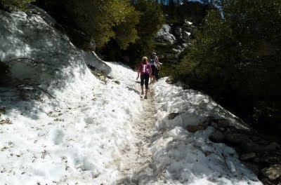 Once we had our fill of both food and the beautiful views, the return to the floor of the valley was one of those situations where the journey down takes almost as long as the way up. By midday, the paths of snow had turned slushy and slippery, and the combination of technical footing and steep descents dictated that we go fairly cautiously, especially in the company of little legs that had completed their second major day of climbing in a row. We didn't have any serious problems, though …