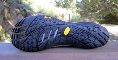 Turned upside down, you can't tell a difference between the male and female shoes; they both utilize the identical Vibram TC-1 rubber outsole that provides great traction in nearly all trail conditions, and has proven to be extremely durable after hundreds of trail miles (my model) and approximately 100 mixed road and trail miles (my wife's). I had a couple of small quibbles with this outsole in my Trail Glove review, but I have to say that I'm very impressed by how the lugs have retained their thickness even after extensive use.