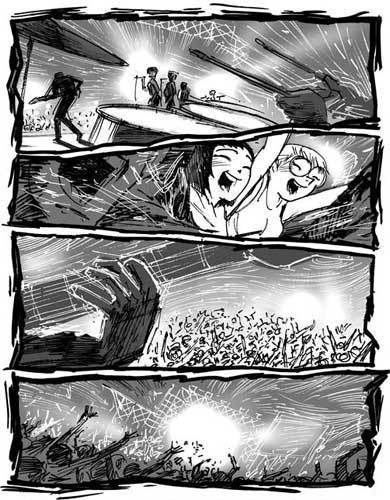 When I work on my stories I always play them in my head as movies with sound, music and motion which is why I’ve always felt hindered by the limitations of the static comic book page. Music is especially tricky to interpret although I did my best with the “Night and Day” sequence in After Eden, and this concert scene from Martial Law Babies (the page on the right), but I guess it’s not the same.
