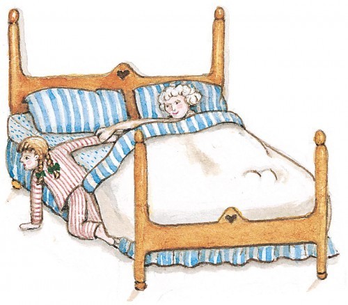 Early one Christmas morning, eyes wide open in the dark bedroom, listening to the house asleep and creaking, I decided I would really try this time. I would be scientific and patient. I would not hurry childishly. I would think calmly. It felt like it took hours. Inching my way and barely breathing, I rolled onto my belly in what I thought was a “common sleep pattern of activity” and waited. Nothing. No response. She was asleep, purring deeply. I continued. First a flannel-covered leg over the side of the bed, dangling barefoot in the air, then an arm, then the tiniest movements to get the middle of my body out ~ it was going extremely well, I was doing it! The only thing I could hear was my heart beating. All the bedrooms of our geranium-colored house were filled with sleeping souls and every house in our neighborhood was dark, I was the only one awake in the world. Just me and Santa and our date with destiny. I could do this. Extra carefully I slid out another leg thereby dragging myself over the edge of the bed, nose and lips smooshing against sheets as I went. This put me on the floor, on my knees and one hand, next to the bed, with only one arm to bring across the sheets to freedom. I had it made in the shade. Slowly I began to pull my arm toward me and then, after all that, at the last possible moment, my grandma, quick as a jack-in-the-box lighting bolt with a hand on the end of it, reached out, grabbed my arm and said in a shockingly low and unexpected voice, “Where do you think you’re going?”