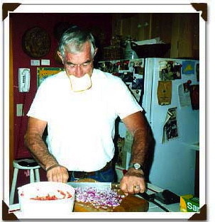 This is my dad. Lots of you know him because he reads this blog all the time and leaves wonderfully helpful and instructional comments we all enjoy reading. My dad, as I’ve often told him, is the smartest person I’ve ever known (but don’t tell Joe). He has the perfect common-sense advice for every problem. He was my daily “fix” the whole time I was writing our book this last winter; he kept me going with the most positive encouraging words. ♥ His interests range far and wide, from the garden to the kitchen. He has the happy gene and life holds unending interest for him. In this photo above he’s in the kitchen of my first little house on the island, demonstrating how to keep from crying while cutting up onions.