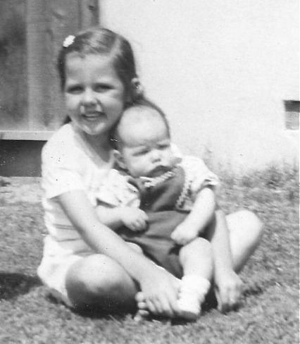 This is me and brother number three, Chuckie. I could knock on the wall of my bedroom and he would climb out of his crib and come and sleep with me. Terrible picture of him because he was truly the cutest of them all, as you will see in the next photo. He was over ten pounds when he was born and I think he got a little smashed.