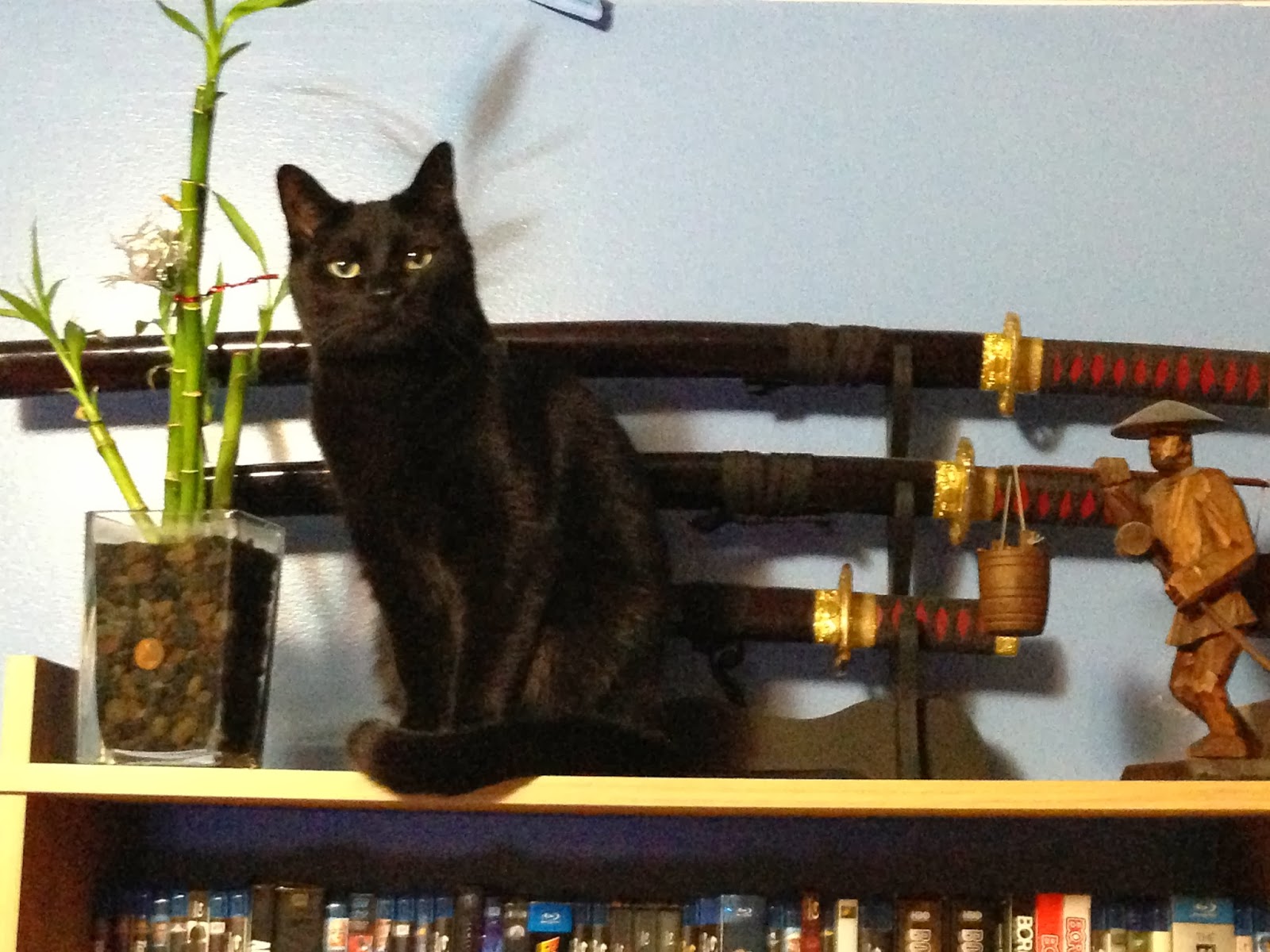 So for months I was at war with this kitten. I moved the movie shelf further from the other furniture so it was a more difficult jump. I placed little knickknacks and such around the shelf to barricade his path. Every time I caught him approaching the shelf I'd spray him with water.