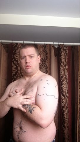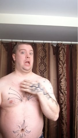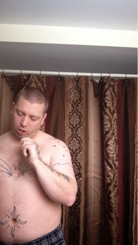 Oh, sure! NOW I feel ashamed! Not at the start of this when I decided to blog topless! NOW! "Everything is fine and wonderful until you accidentally salute the The Third Reich in the morning!" Perfect! That'll sell the books. Because everybody knows how much we want to see flabby dudes brush their teeth on the Internet.