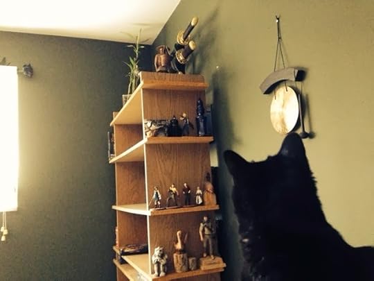 On occasion I'd get home to discover gravel and bamboo stalks scattered around my bedroom. Sometimes with a drying waterfall still dripping down my blu ray collection. Once Polaris was even in the middle of this, lying on his back, purring and scratching himself with all the scattered stones. At least until I spray bottled his belly. And there are two notes about this. First, I'd have to spend the next little while gathering up Maokai and placing him in a damp washcloth while I gathered up all the gravel, cleaned it off, and replanted him with just a little gravel at a time. You really have to make sure the roots are spread out and anchored at various depths. At least, that's what I tell myself. I really have no idea but the plant is still alive after multiple uprootings so I think I"m doing something right. Second, I bet my blu ray collection would look even cooler if it had a waterfall pouring over it.