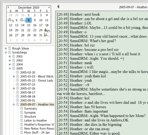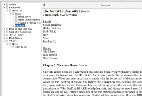 I started with that chat log, and used it as the root entry for a collection of notes about the story: the summary, a rough outline, research, and even some correspondence with Heather (where I had her come up with names for most of the horses).