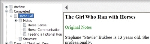 Most of the sub-entries under "Notes" for the Horse Girl project were from my research into horses and horse ranching. I'll admit it: I'm a city boy. I've ridden horses only a few times in my life, and never as an adult. I had a lot of research to do, even just for the outline. I kept track of most of it here. I would copy the link to the articles I found–and usually I would copy the entire text of the article (and most of the images) into an entry. Because you never know if Web articles are gonna stay where you found them.