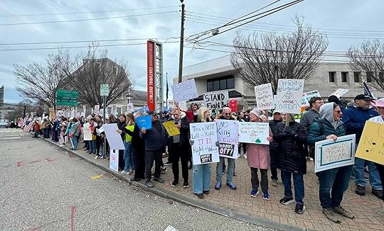 It looked like more than 500 were gathered around the old courthouse in New London when Bella and I arrived, with more streaming in from the nearby streets. The courthouse is a wooden structure built in 1784, just a few years after the Revolutionary War. It was constructed during the same time that the nation was being built and just beginning to find its own way as a republic. And here we were, 241 years later. Worried. Upset. But together during this moment. And trying to construct our own responses, pushing back against the chaos and crudeness of the last nearly three months of an incomprehensible second term for Donald Trump.