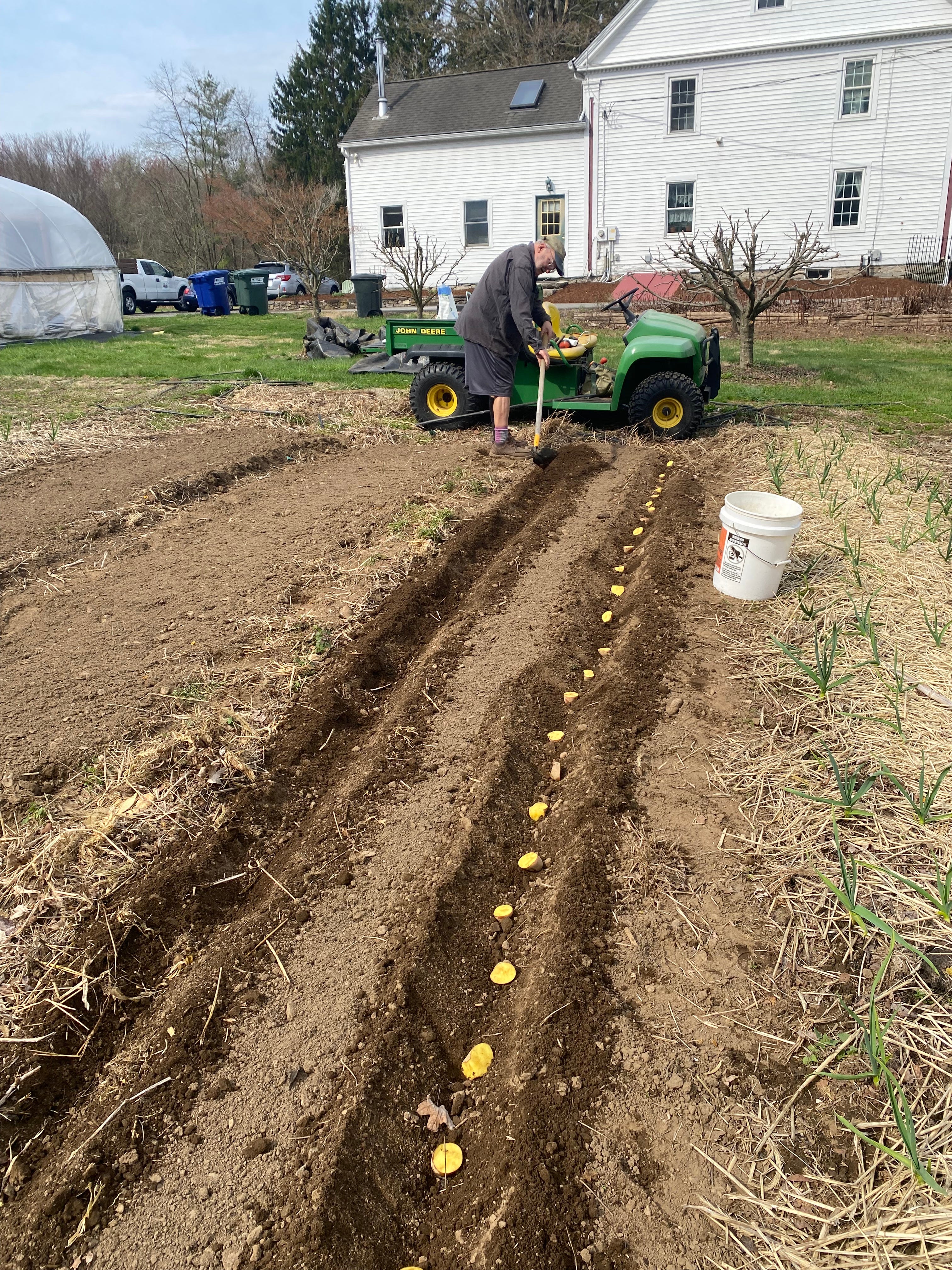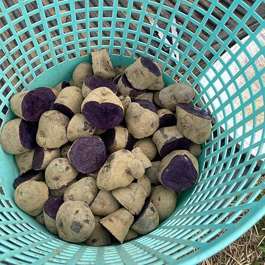 A partial row of potatoes, with Pete cutting others. The pail is for the rocks we find in the soil, which are endless. The row of potatoes is next to a row of garlic, which will be harvested in July. The mystery was solved when the seed potatoes began to arrive. Five-and 10-pound bags of Magic Mollies, which are a deep purple, arrived. Red thumbs, which look exactly as described. And Pinto Golds, which are a lovely combination of red and gold potatoes.