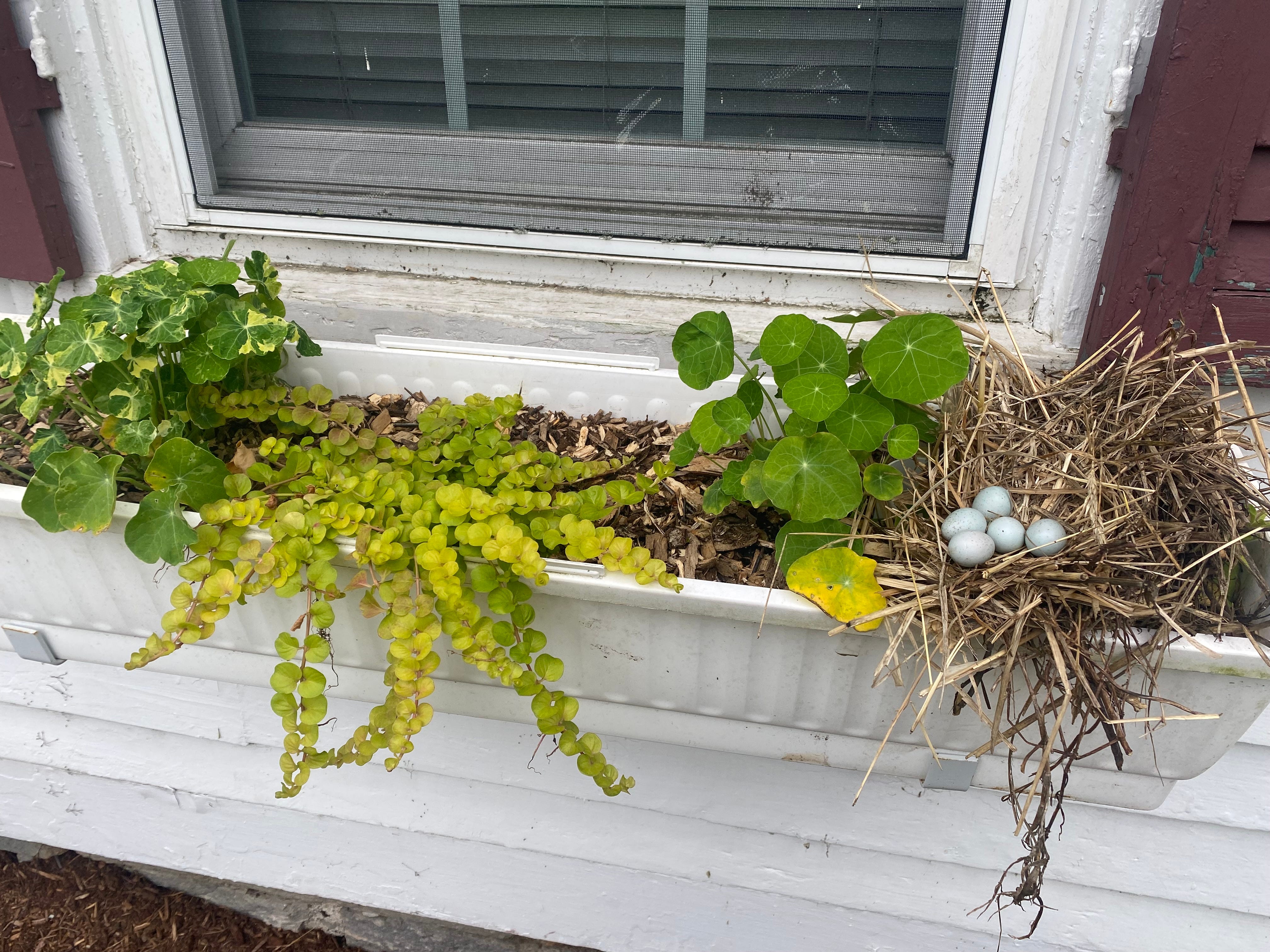 A nest. With eggs. He couldn’t bear to toss the nest and eggs away and neither could I, so he put them in a window box, hoping Mama would return.