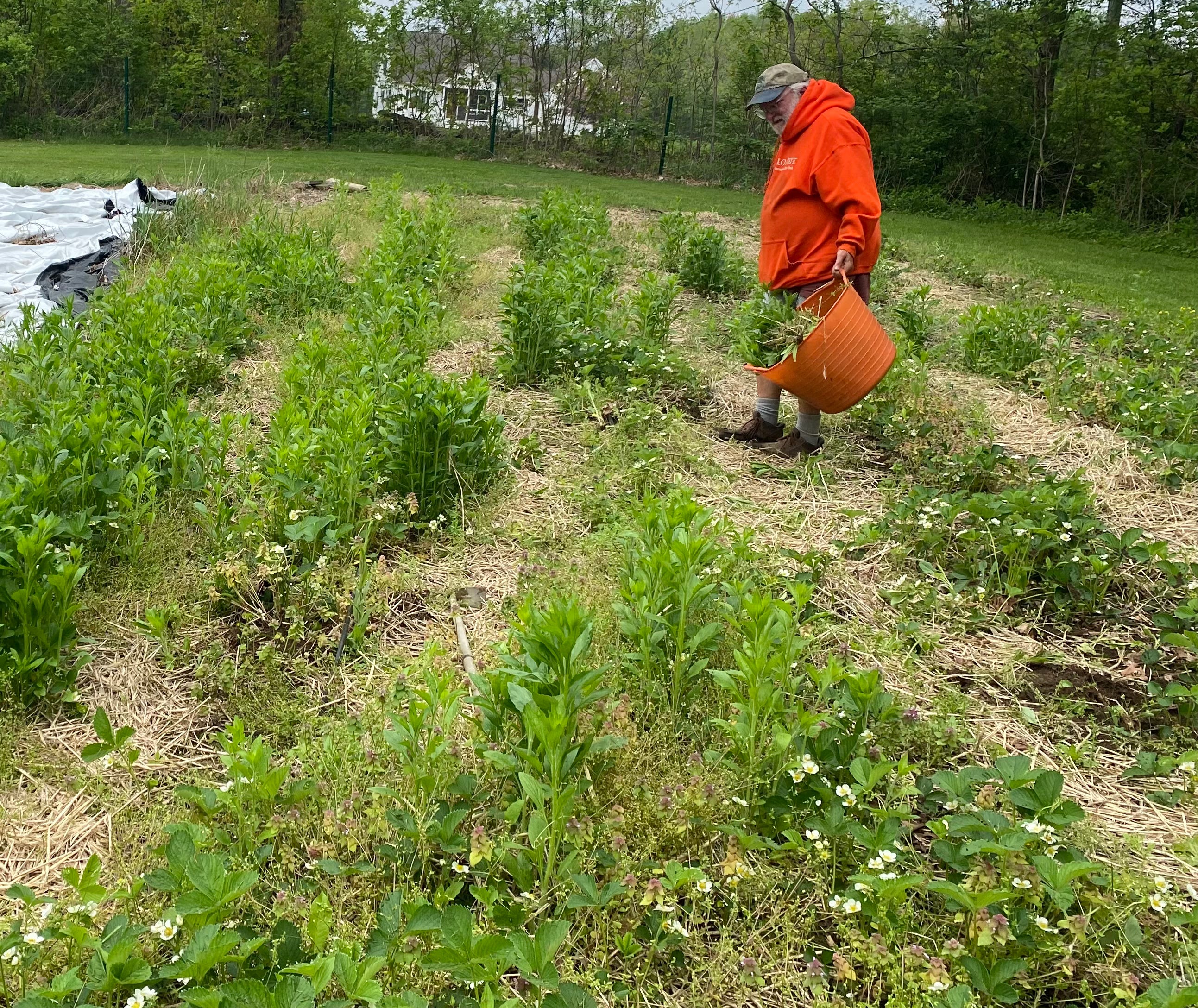 This is what a few days of rain will do. The white flowers are the strawberry plants; the tall, malevolent plants are the rampaging weeds. They are gone now! Here, Pete holds a container full of weeds he has pulled out. After days of rain, Pete said to me, in his understated way, “I could use help weeding the strawberries.” I went out to take a look and realized the situation was close to an emergency. The weeds had shot up after just a few days of rain. Last year, we planted 800 strawberry plants knowing that the second year - this year - the fruit would produce in earnest. The weeds threatened what we thought would be a good spring harvest. I grabbed some tools and headed out to the field.