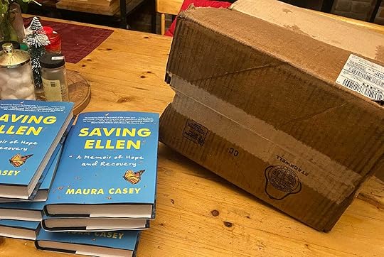 I forgot the wind, the rain, and the dogs as I reached for the box. The cardboard was so soaked the sides sloughed off, the tape holding them together unraveling. Could the books possibly have survived? But there were layers of paper on top, the last bastion of defense against the storm, and the books, somehow, were fine. Pete smiled and hugged me and I lifted my book, “Saving Ellen: Memoir of Hope and Recovery,” with its lovely blue cover, out of the now ragged box. The book will be published April 1, but here was an initial 10 copies, just for me.