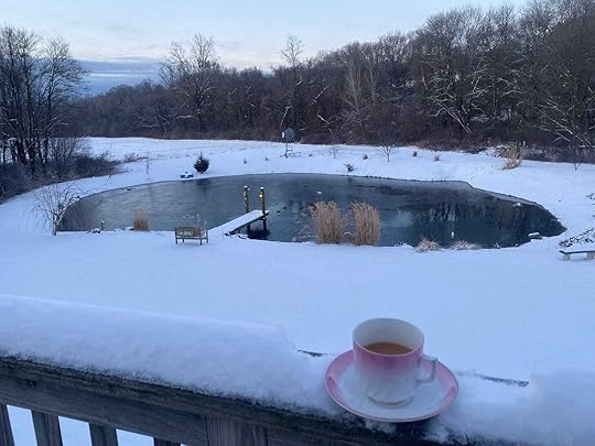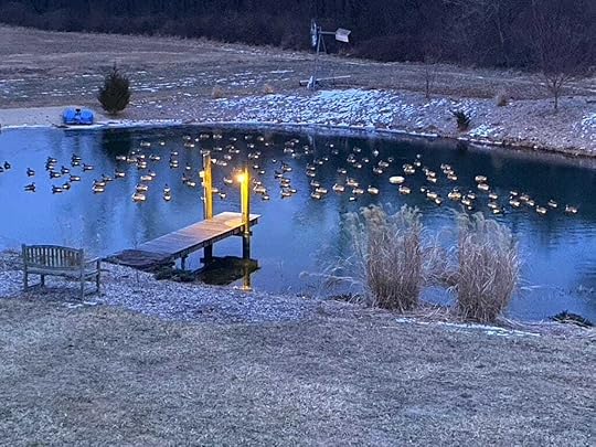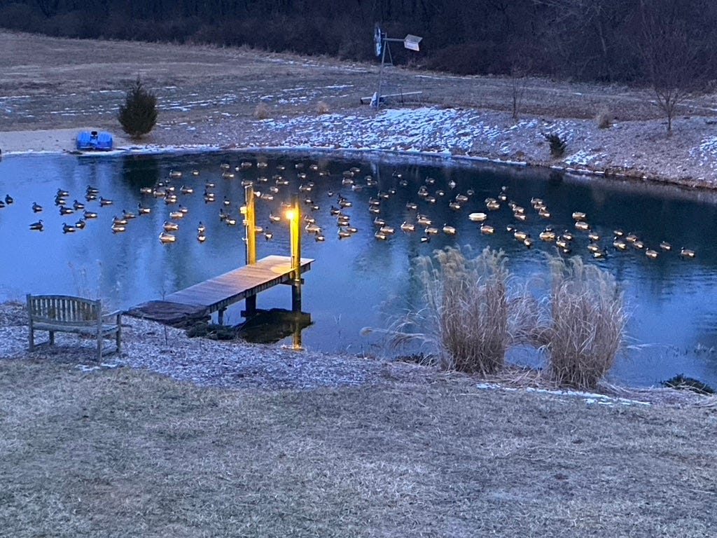Morning tea with the ducks (near the dock), as the pond, ever so slowly, ices over.Because our spring-fed pond almost never freezes, in winter several pairs of ducks always come by and hang out. But several weeks ago a flock of about 80 geese evicted them, taking over the pond completely, apparently delighted to find open water. This has never happened before, and I wondered how long the big birds would stay. I watched them sleep at night, floating on the water and swimming in unison during the day.