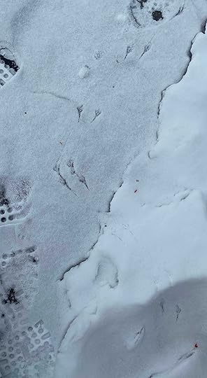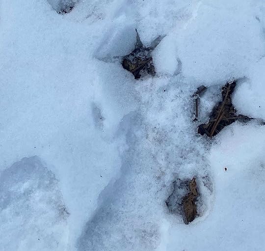 There are rabbit tracks and tracks of the opossum, pawprints of coyotes, tiny prints of squirrels scrabbling for the acorns they just know they hid somewhere around here months ago and the cloven hooves of deer nosing around for a few sprigs of grass under the ice. There are tracks that force me to surf the internet for clues because I can’t imagine what or who on Earth they are from.