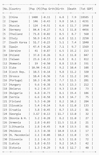 In terms of GDP, the 32 Countries in the table generate ca. $47 trillion/year, nearly half of the world’s GDP (107 trillion/year), more precisely 40.7%. In terms of per capita comparison, these countries have an average of $21,042, to be compared with the world’s average of $14,042. These declining countries are substantially richer than those that show a population increase, even considering the disastrous performance of the bottom ones with Ukraine at $5,200/person.