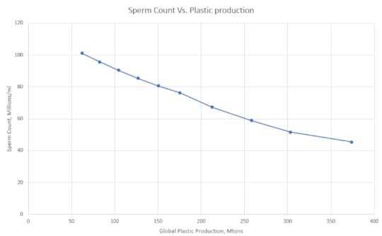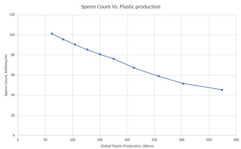 Are we sure that the decline of sperm count is related to plastic pollution? I couldn’t find a study on this subject in the scientific literature, so I asked DeepSearch (an AI made by X) to create one. In a few minutes, Deepsearch produced a full scientific paper that I report at the bottom of this post. Below, you can see the graph of the data. I know that correlation doesn’t mean causation, but we know that many plastic additives are endocrine disruptors affecting the human metabolic processes. Ignoring that correlation may indicate causation means taking a risk that we can’t afford to take.