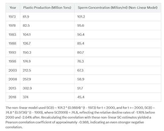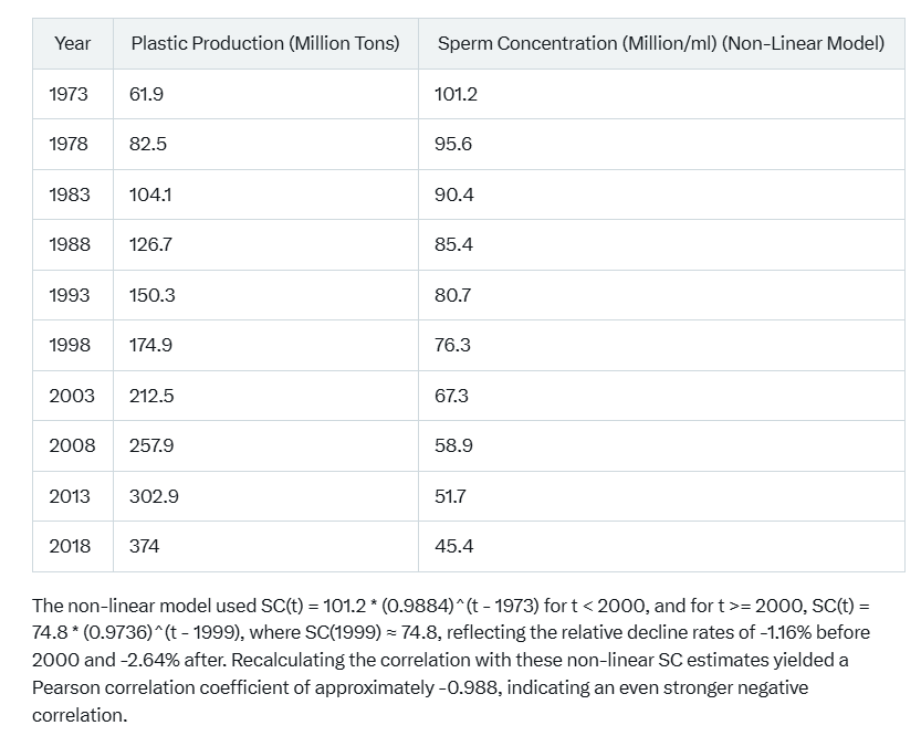 Accounting for the increasing decline rate, the exponential model showed SC declining at -1.16% per year before 2000 and -2.64% per year after, aligning with the acceleration in plastic production post-2000. This non-linear modeling suggests a steeper than linear decline, potentially strengthening the correlation, as both variables show accelerating trends. The biological plausibility is supported by studies linking endocrine-disrupting chemicals (EDCs) in plastics, such as phthalates and bisphenol A, to reduced sperm motility and concentration, with a 2024 study detecting microplastics in all human semen samples [referenced in earlier context, no direct URL].