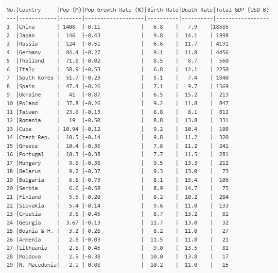 To understand the situation, I prepared some data taken from my upcoming book, summarizing the status of all the countries that have a negative change in population. These countries are ordered starting with those with the largest population. China is at the top, very small countries are not included. The US is not in the table because it is still weakly growing. (data provided by Grok — note that the rates consider only births and deaths, emigration/immigration is not included).