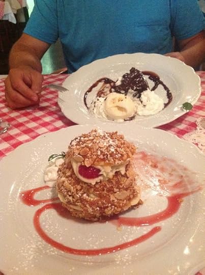 Below, you see Fallen Chocolate Soufflé with fresh whipped cream and chocolate sauce AND Strawberry Napoleon with candied-almond crusted pastry layered with pastry cream and strawberries. Yes, both desserts were DELICIOUS!