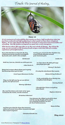 There are a lot of other great poems and artwork in Issue 10 of Touch: The Journal of Healing. Check out the Editor's Choice: Carol Lynn Stevenson Grellas. There is also work by: Ed Bennett, Jackie Fox, John Davis Jr., Richard King Perkins II, Danny P. Barbare, Pat St. Pierre, Tammy Daniel, Emily Lasinsky, Murray Alfredson, Stephen Gilchrist, Krisztina Fehervari, and Susan Kelley.