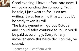This is the message I woke up to this morning. My publisher decided that she was dropping all of us authors and focusing on her own thing.
