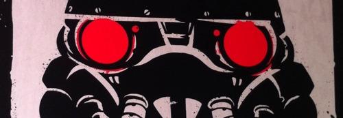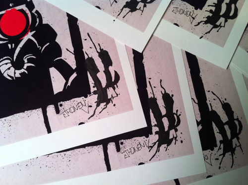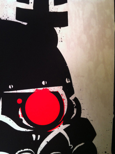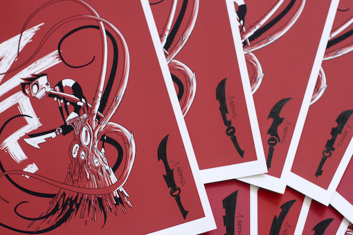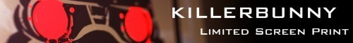 This time around it's scary stencil image of Fillerbunny's robotic nemesis Killerbunny. There are 30 of these things, each one of them customized with an inky blob that looks suspiciously like Fillerbunny himself. Like the custom Bolt Coughers, each Killerbunny print is $35, printed on 8in x 11in quality heavy matte, signed and dipped in demon urine.